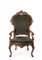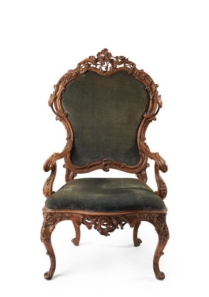 Poltrona in noce con schienale sagomato, riccamente traforato ed intagliato a volute fogliate e fiori. Braccioli mossi terminanti a riccioli, gambe e fascia decorati a mazzi fioriti e foglie. Venezia, secolo XVIII (lievi difetti)