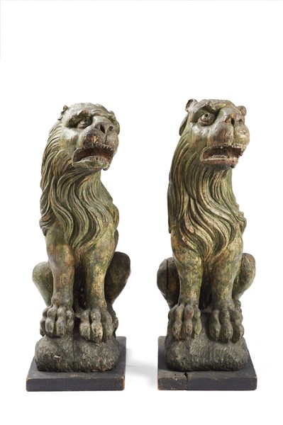 Arte veneta, fine secolo XVII. Due sculture in legno dipinto raffiguranti leoni