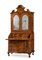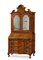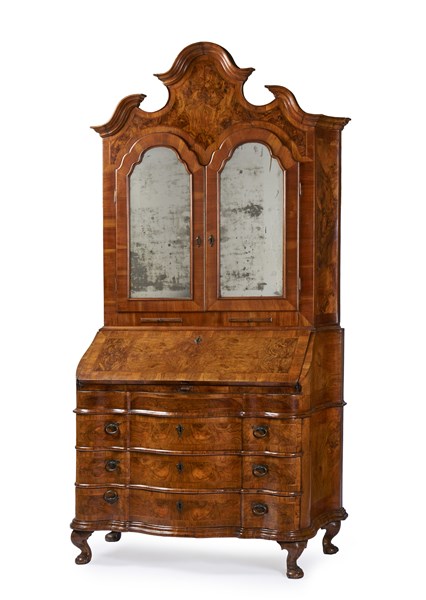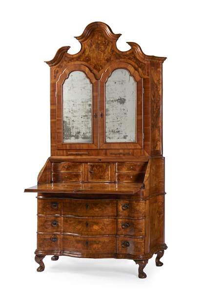 Trumeau lastronato in noce e radica, parte inferiore con fianchi e fronte mossi a tre cassetti e calatoia celante scarabattolo a quattro tiretti, antina e piano con segreto. Parte superiore a due ante con specchi e cimasa a timpano spezzato. Piedi ad artiglio su sfera. Emilia, secolo XVIII (cm 125x246x60) (rifacimenti e restauri)