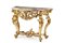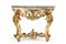 Console in legno intagliato e dorato a volute e fiori, gambe riunite da travers