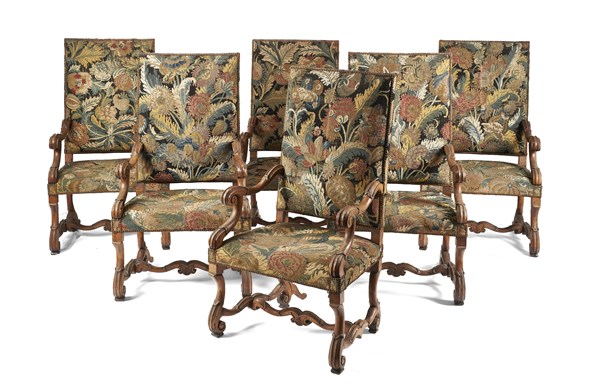 Gruppo di sei poltrone in noce con gambe, montanti e braccioli intagliati terminanti a ricciolo, traverse sagomate decorate all'attacco da motivo vegetale. Seduta e schienale rivestiti in tessuto Aubusson. Liguria, secolo XVIII (difetti; aggiunte di epoca posteriore)