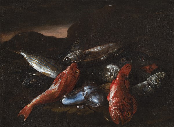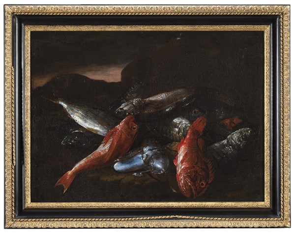 Lotto 291 | Giuseppe Recco Composizione con pesci e seppia all'apertoOlio su tela, cm 71x9