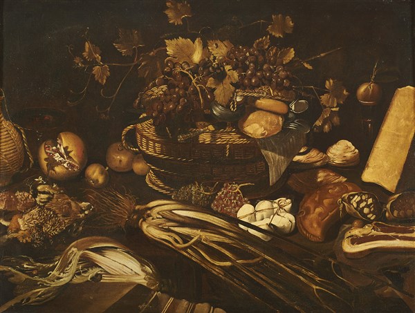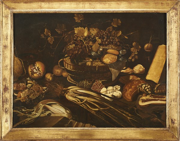 Seguace di Cecco del Caravaggio Composizione con canestra di frutta e verdure