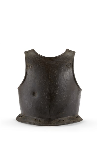 Pesante corsaletto con nervatura centrale, tracce di antiche incisioni compreso di falda con attacchi per le scarselle. Nella parte di sinistra è presenta una “prova di botta”. Inizio del secolo XVII (h. cm 37) (difetti)