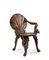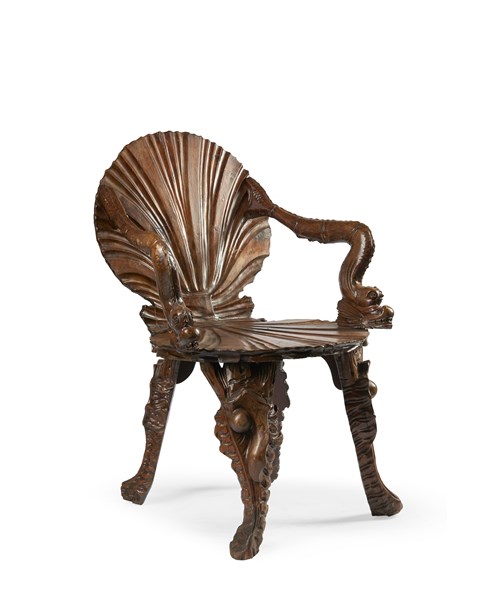 Poltrona a "grotto" in legno intagliato con schienale, seduta e gambe a conchiglia, braccioli scolpiti a mostri marini. Venezia, secolo XIX. Recante etichetta cartacea sotto la base (difetti)