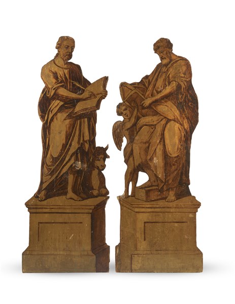 18th-century art. Pair of carved, pierced and grisaille-painted wooden silhouettes depicting evangelists (h. cm 120) (defects)