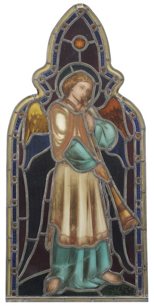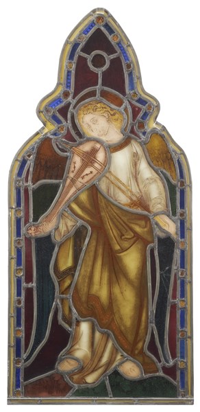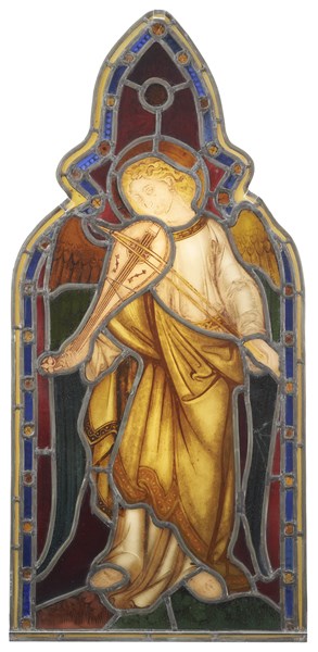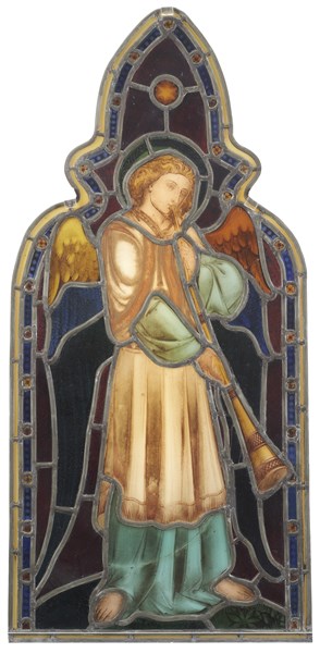 Coppia di antichi pannelli a vetri policromi dipinti e piombati entro teche lum