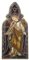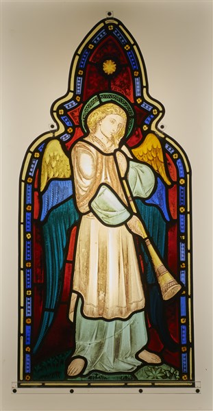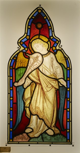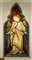 Pair of antique polychrome painted and leaded glass panels within plexiglass lighted showcases (cm 105x55,5) (minor defects)