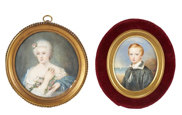 Art of the 19th century. Lot consisting of two miniatures on ivory depicting child and gentlewoman in different frames (h. max cm 11) (defects)