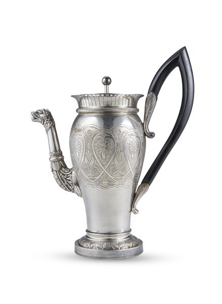Caffettiera in argento a balaustro con collo traforato a foglie, versatoio zoomorfo, decoro inciso a volute e fiori stilizzati, manico in ebano e coperchio con presa a sfera. Budapest, 1822. Argentiere A. Giergl. Etichetta di collezione sul fondo (h. cm 25,5) (g lordi 810) (lievi difetti)