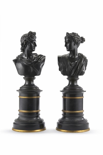Scultore del secolo XIX Apollo e Diana Due busti in bronzo brunito su base a co