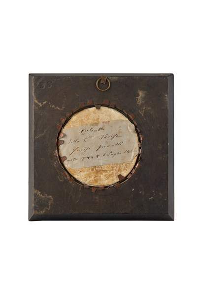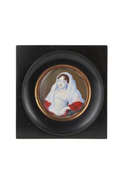 Master of the early 19th century. Portrait of Countess Fucila Grimaldi, round miniature on ivory (d. cm 7) Inscribed on back. In frame (cm 13,4x13,8) (defects)