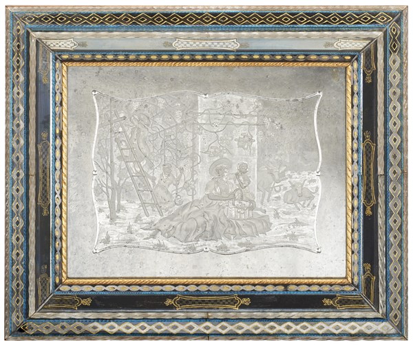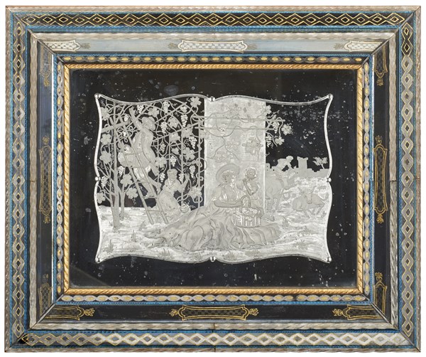Arte veneziana. Specchiera con cornice in vetro policromo, parte interna in legno dorato e cordonato. Specchio inciso con scena di vendemmia entro cartella sagomata (cm 62x52) (difetti)