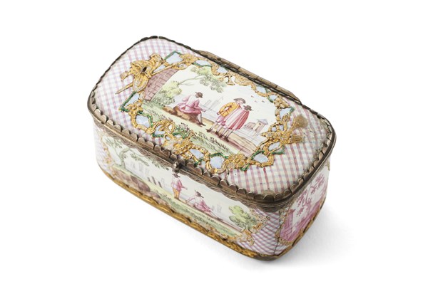 Lotto 354 | Manifattura francese del secolo XVIII. Tabacchiera in smalti decorata a riserve
