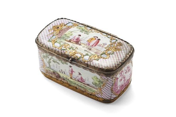 Manifattura francese del secolo XVIII. Tabacchiera in smalti decorata a riserve