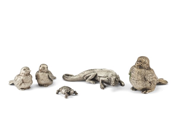 Mario Buccellati (Ancona, 1891 - Milano, 1965) Cinque figure in argento in foggia di volatili, tartaruga e lucertola. Titolo 800. Marcate alla base (L. max cm 5,5) (g 150) (difetti)