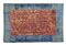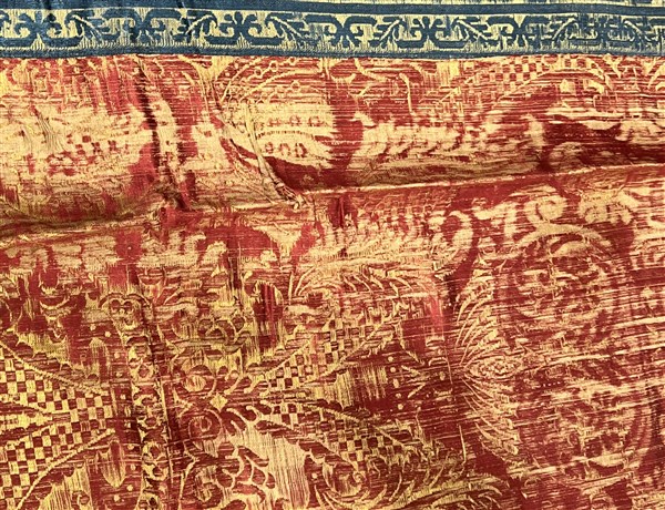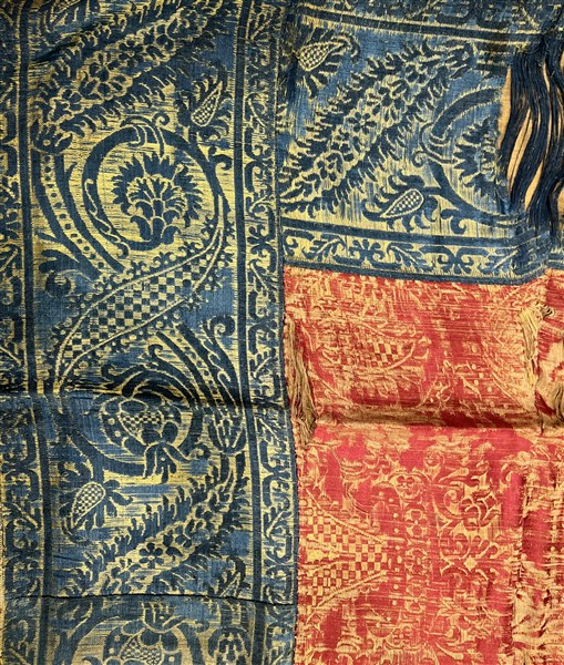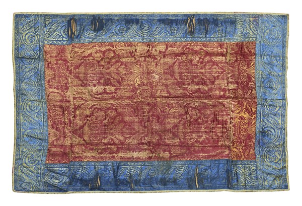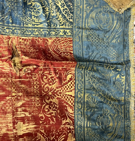 Arazzo composto da frammenti di tessuto lampasso da parati a doppio corpo in damasco di raso di seta rosso sostenuto da trama e ordito in cotone, bordura a meandro in blu della medesima tessitura. Decorazione con vaso di fiori e corone. Genova, secolo XVI (cm 293x190) (gravi difetti)