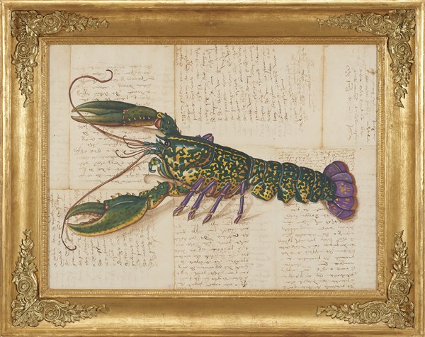 Cornice in legno con applicazioni in papier maché contenente un acquerello raffigurante aragosta su composizione di fogli antichi (cm 60x75,5) (restauri)