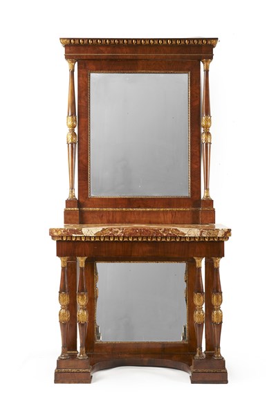 Lotto 380 | Console con specchiera impiallacciata in radica di noce con montanti a balaustr