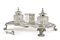 Calamaio in argento con doppio flacone in vetro molato e coperchio in argento cimato da sfera, basamento a profilo mistilineo inciso a volute su piedi a ricciolo, al centro vasca ottagonale. Londra, 1882 (cm 30x13) (g 660) (difetti e mancanze)