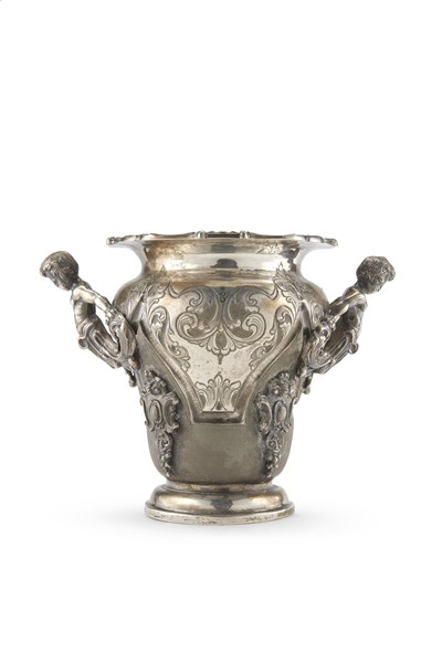 Vaso in argento a balaustro con anse a busto di putto e attaccature a foglie, c