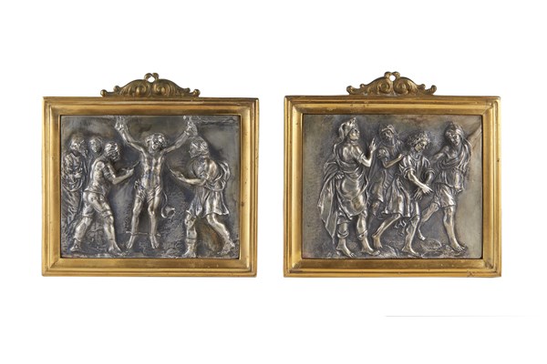 Arte del secolo XVIII. Coppia di rilievi in argento raffiguranti scene di cattura e di tortura (cm max 11x9) In cornici in metallo dorato (lievi difetti)
