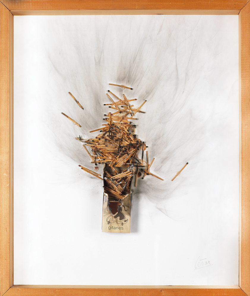 CESAR Marsiglia 1921 - 1998 Gitanes tecnica mista e collage su tela applicata su tavola cm. 53,9x45x5,1, firma in basso a destra, etichetta della Christie's al retro che riporta: Provenienza Galerie Ferrero Nice e opera archiviata al numero 6856 presso l'Archivio Denyse Durand-Ruel Paris.