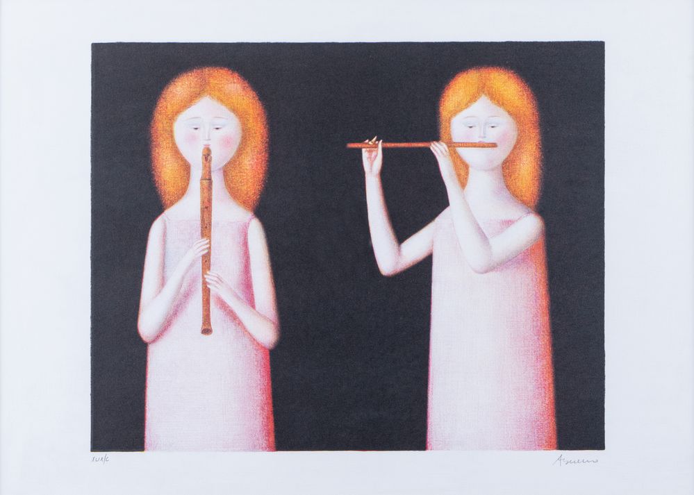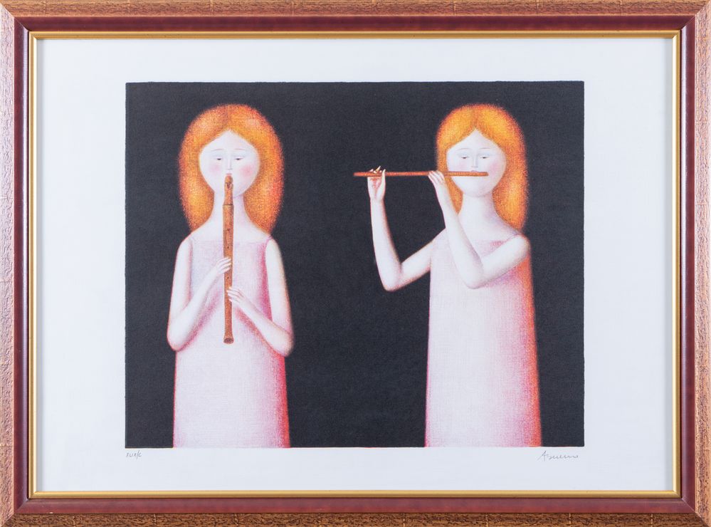 ANTONIO BUENO (Berlino 1918 - Fiesole 1984) "Concertino". Litografia a colori su carta. Foglio: cm 50x70; lastra: 39,5x50. Reca numeri di tiratura in numeri romani in basso a sinistra XLIX/C. Opera firmata in basso a destra A. Bueno. Opera accompagnata da certificato di autenticità di Telemarket.