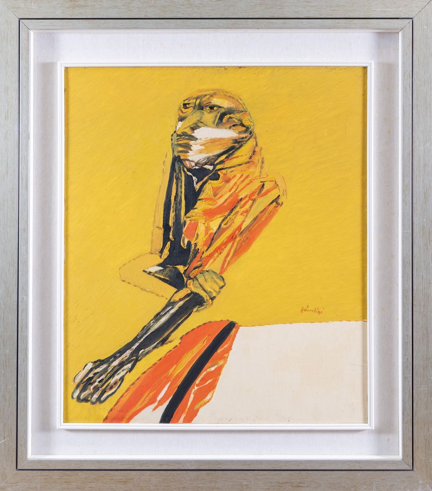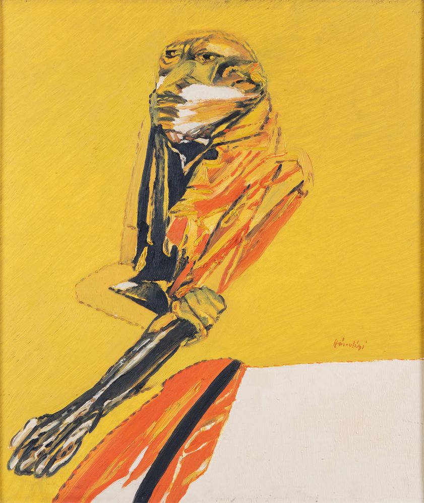 REMO BRINDISI (Roma 1918 - Lido di Spina 1996) "Uomo con divinità", 1964. Olio su tela. Cm 70x60. Opera firmata in basso a destra Brindisi. Al retro reca scritta per autentica Olio del 1964 autentico, a firma del pittore. Al retro reca timbro della Galleria Pace. Opera n. 250 dell'archivio della Galleria Pace. Opera accompagnata da autentica su fotografia con firma del pittore.