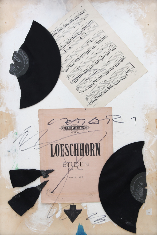GIUSEPPE CHIARI Firenze 26/09/1926 - Firenze 10/05/2007 Senza titolo tecnica mista, collage e frammenti di disco in vinile su tavola cm. 78x53, firma al centro.