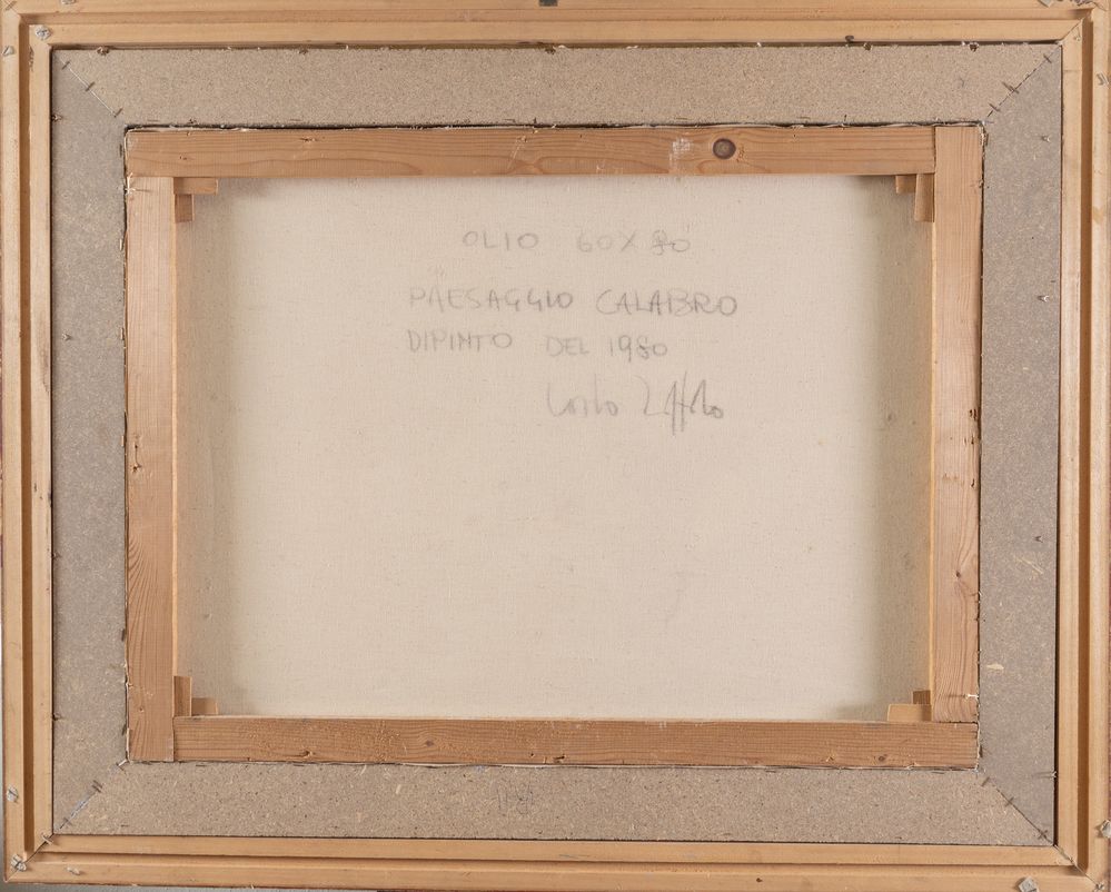 Pittore anonimo del XX secolo. "Paesaggio calabro", 1980. Olio su tela. Cm 60x80. Opera firmata in basso a destra. Al retro opera intitolata firmata e datata Paesaggio calabro, 1980.