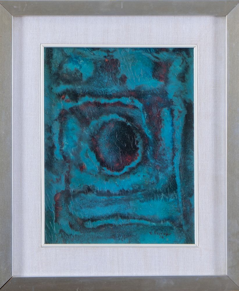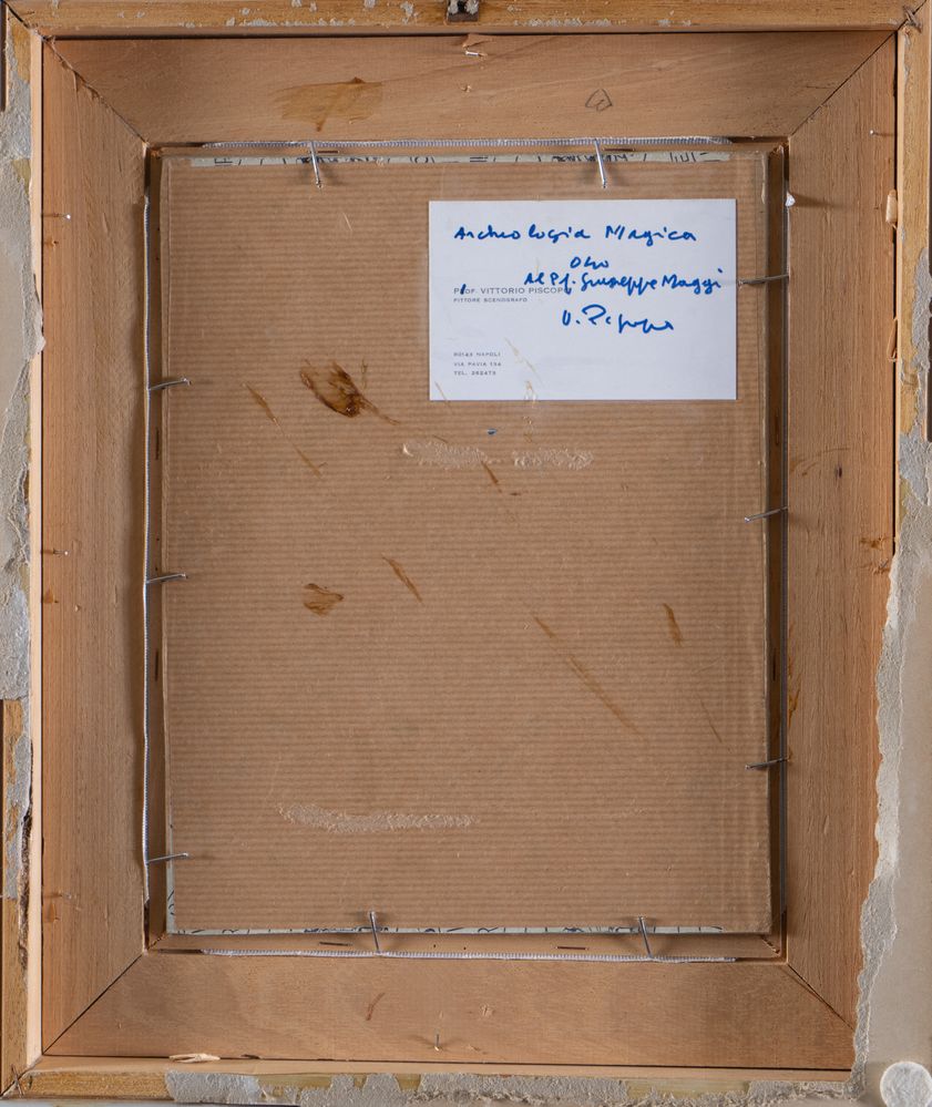 VITTORIO PISCOPO (Acerra 1913 – Napoli 2004) "Archeologia magica", 1976. Olio su cartone. Cm 26x20. Opera firmata e datata in basso a destra V. Piscopo '76. Al retro reca etichetta del pittore.