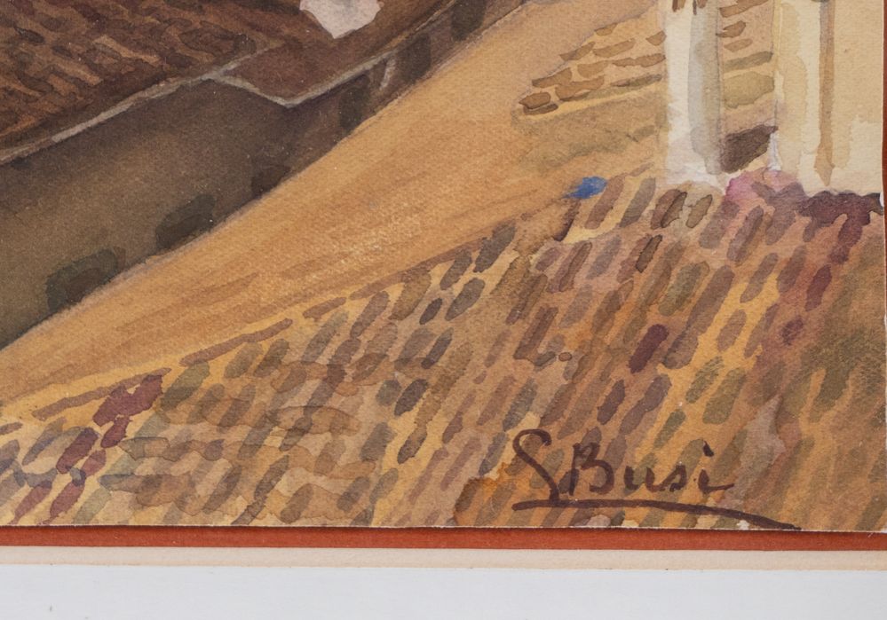 LUIGI BUSI (Bologna 1837 – 1884) "Veduta bolognese". Acquerello su carta. Cm 44,5x31,3. Opera firmata in basso a destra L. Busi.