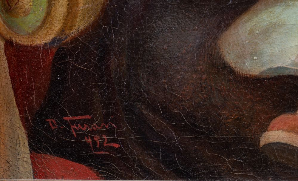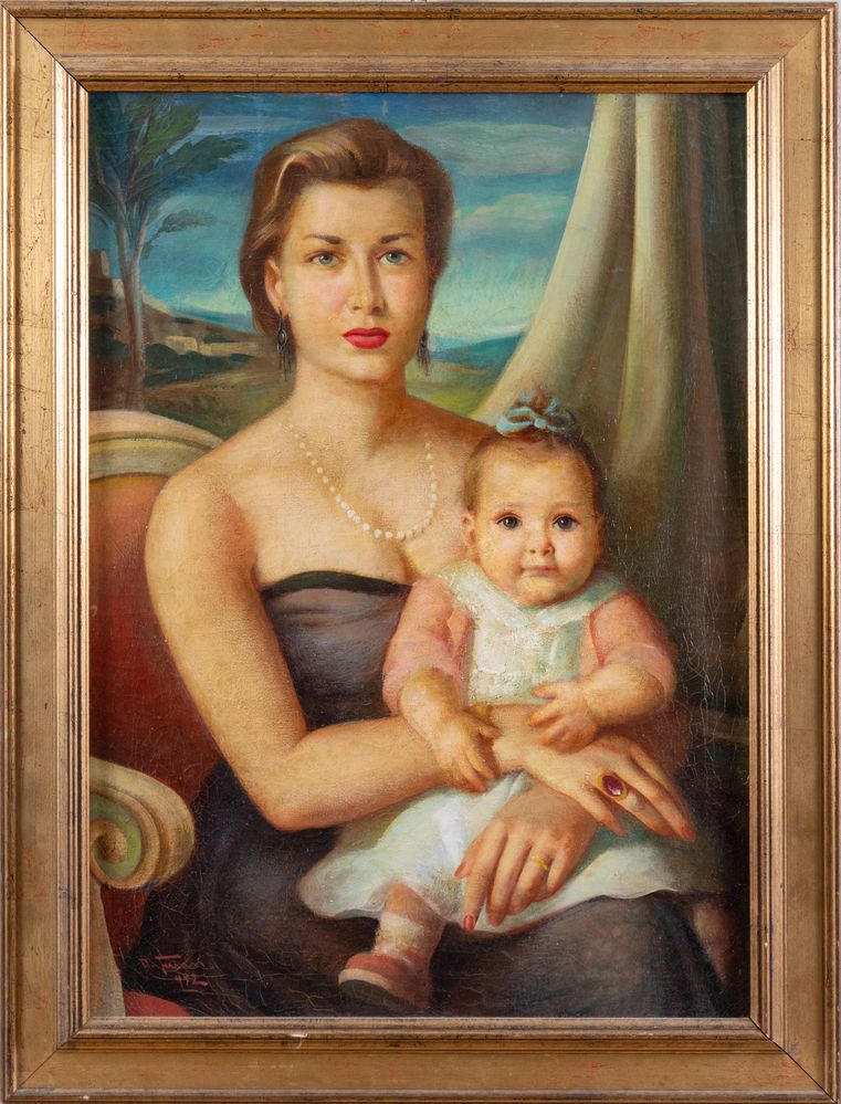 Pittore anonimo del XX secolo. "Ritratto di donna con bambina", 1952. Olio su tela. Cm 73x52. Opera firmata e datata in basso a sinistra.