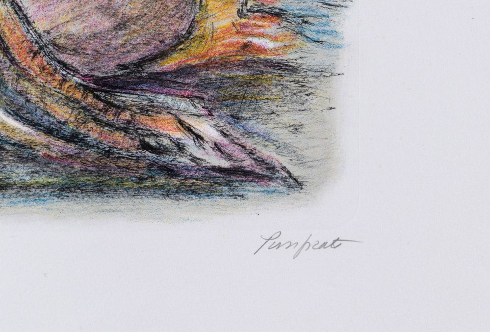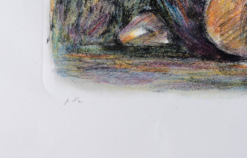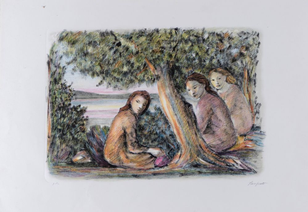 DOMENICO PURIFICATO (Fondi 1915 – Roma 1984) "Tre figure sotto l'albero". Litografia a colori su carta. Cm 50x70. Opera firmata in basso a destra Purificato. Reca numeri di tiratura in basso a sinistra P.D.A.