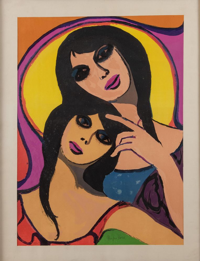 POMPEO BORRA "Le amiche". Litografia a colori su carta. Foglio: cm 69,5x49,5....