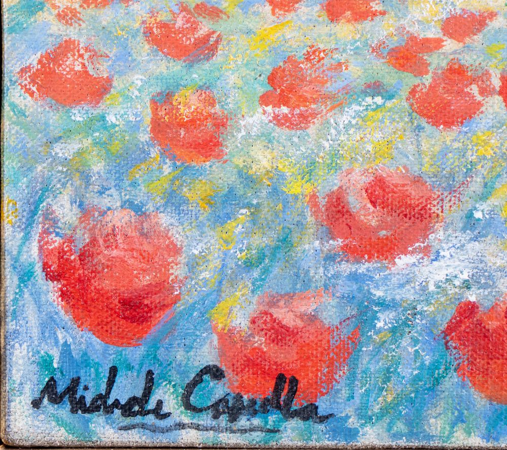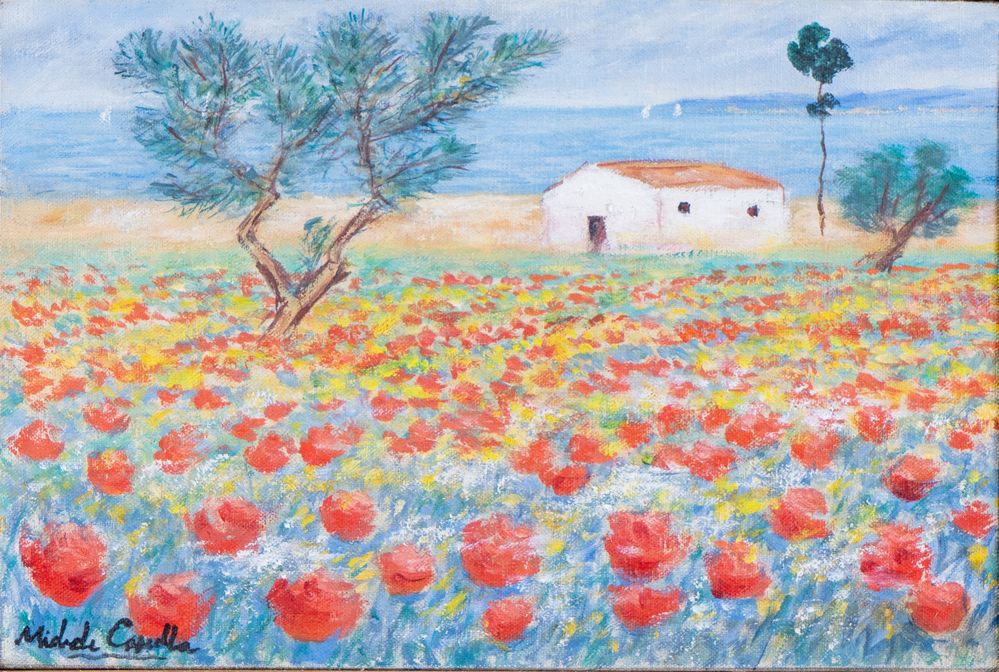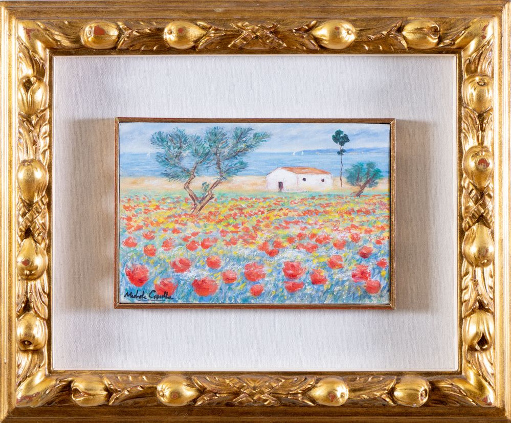 MICHELE CASCELLA (Ortona 1892 - Milano 1989) "Paesaggio con papaveri". Olio su tela. Cm 20x30. Opera firmata in basso a sinistra Michele Cascella. Al retro reca scritta per autentica Da me dipinto, a firma Michele Cascella. Opera accompagnata da autentica su fotografia a firma del pittore Michele Cascella, con numero BE/121.
