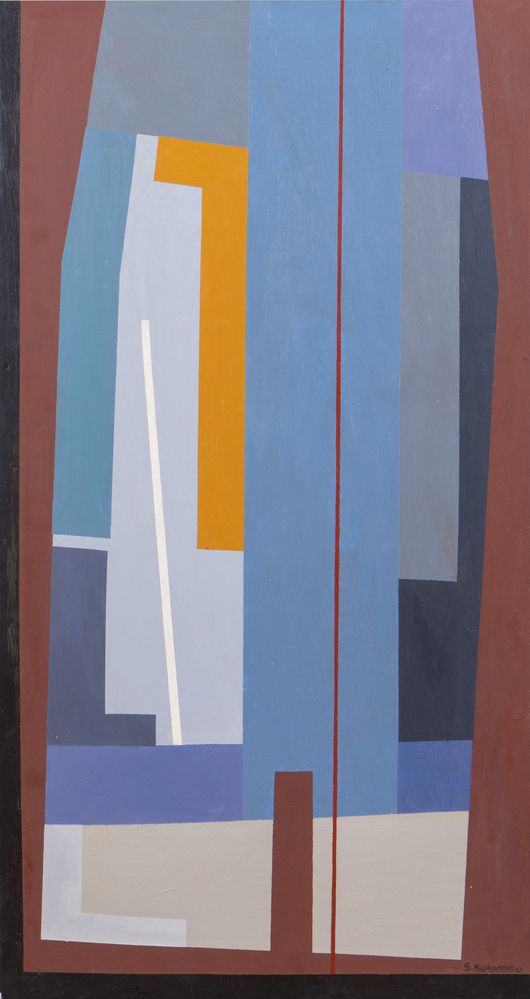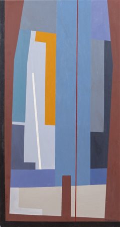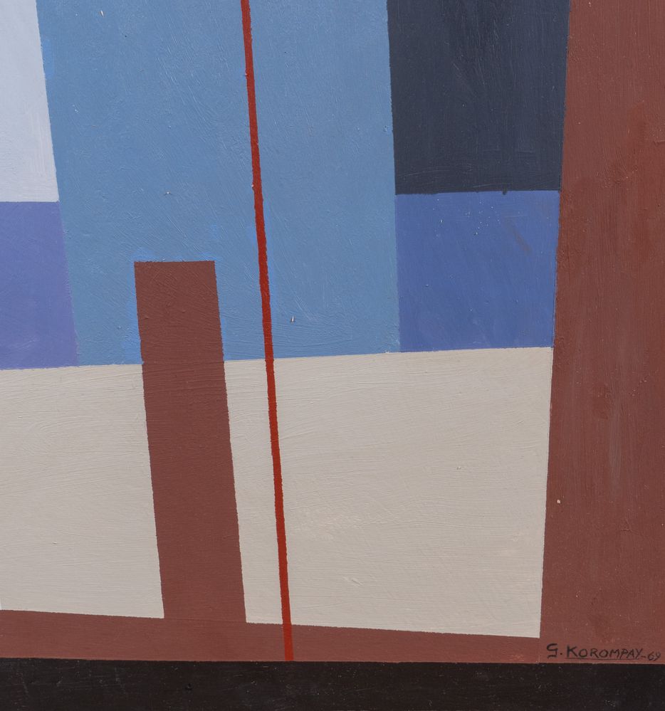 GIOVANNI KOROMPAY (Venezia 1904 - Rovereto 1988) "Cantiere", 1969. Olio su tavola. Cm 96,5x50,5. Opera firmata e datata in basso a destra G. Korompay '69. Al retro opera intitolata, firmata e datata Cantiere G. Korompay '69. Al retro reca timbro dell'Archivio collettivo Artisti Contemporanei, Galleria Maggiore, Roma con firma.