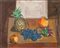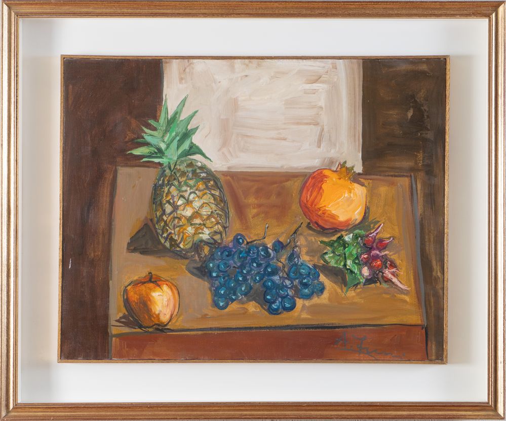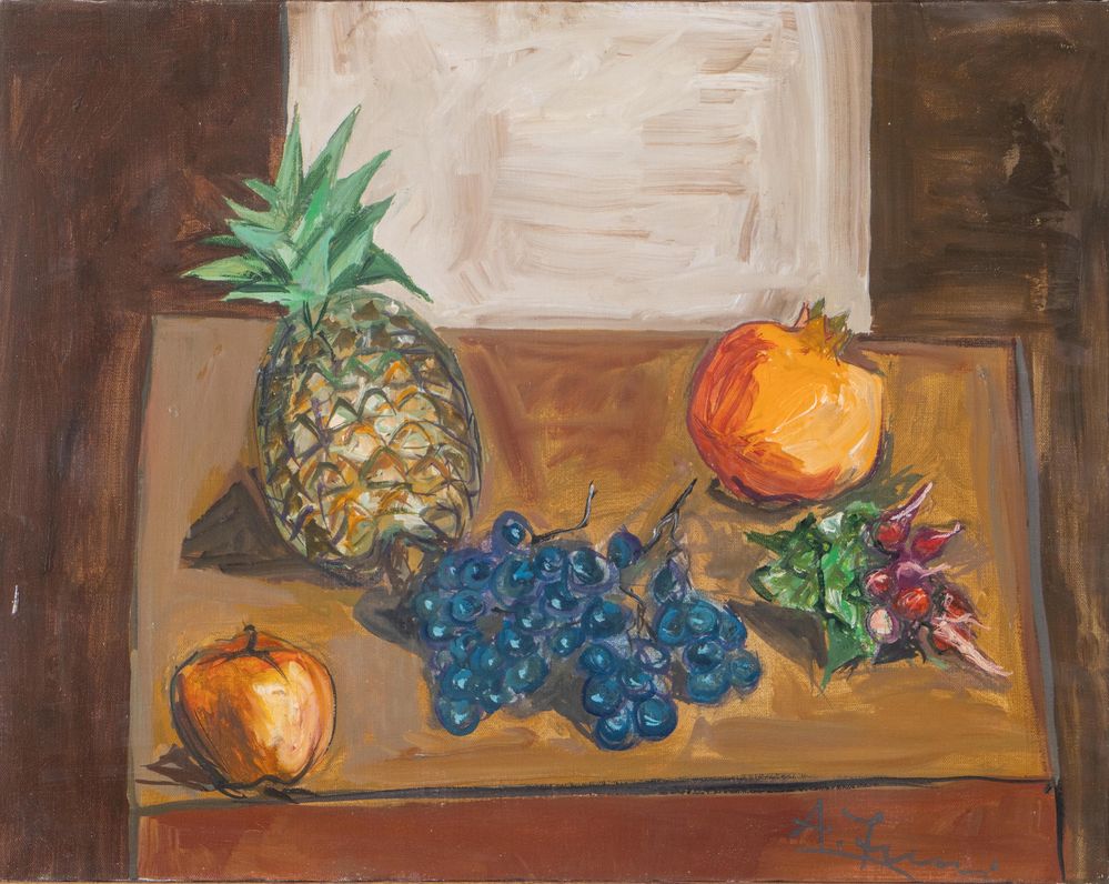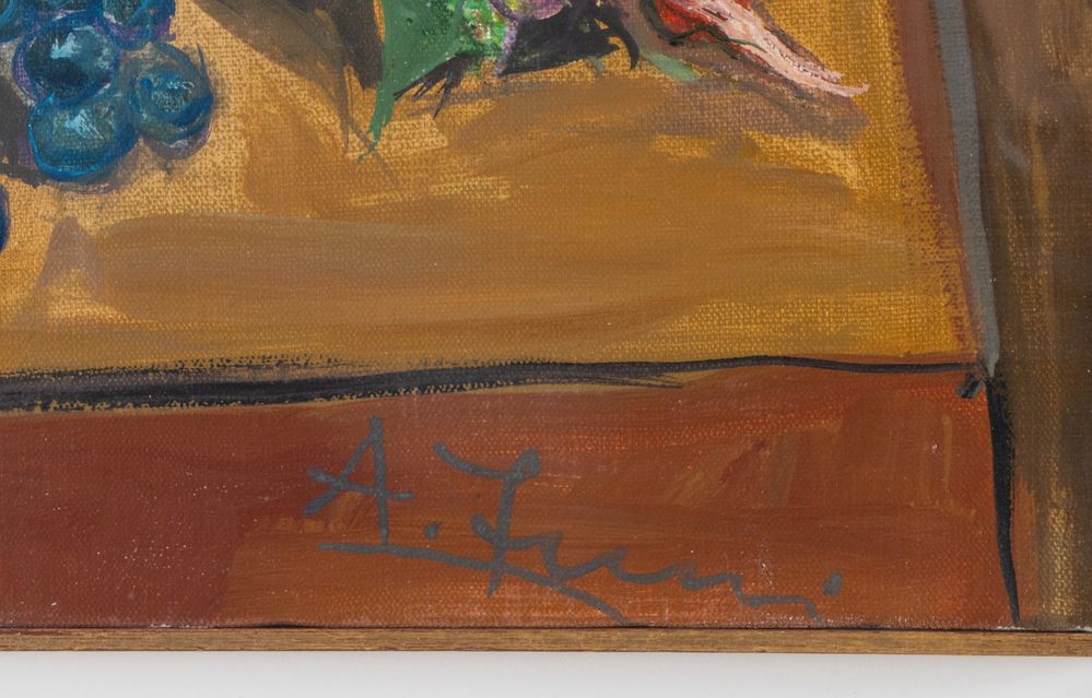 ACHILLE FUNI (Ferrara 1890 - Appiano Gentile 1972) "Natura morta con uva", 1965. Olio su tela. Cm 50x64. Opera firmata in basso a destra A. Funi. Al retro reca etichetta del Centro d'Arte di Via B. Cavalieri, 6, Milano, con timbro e firma indecifrata.