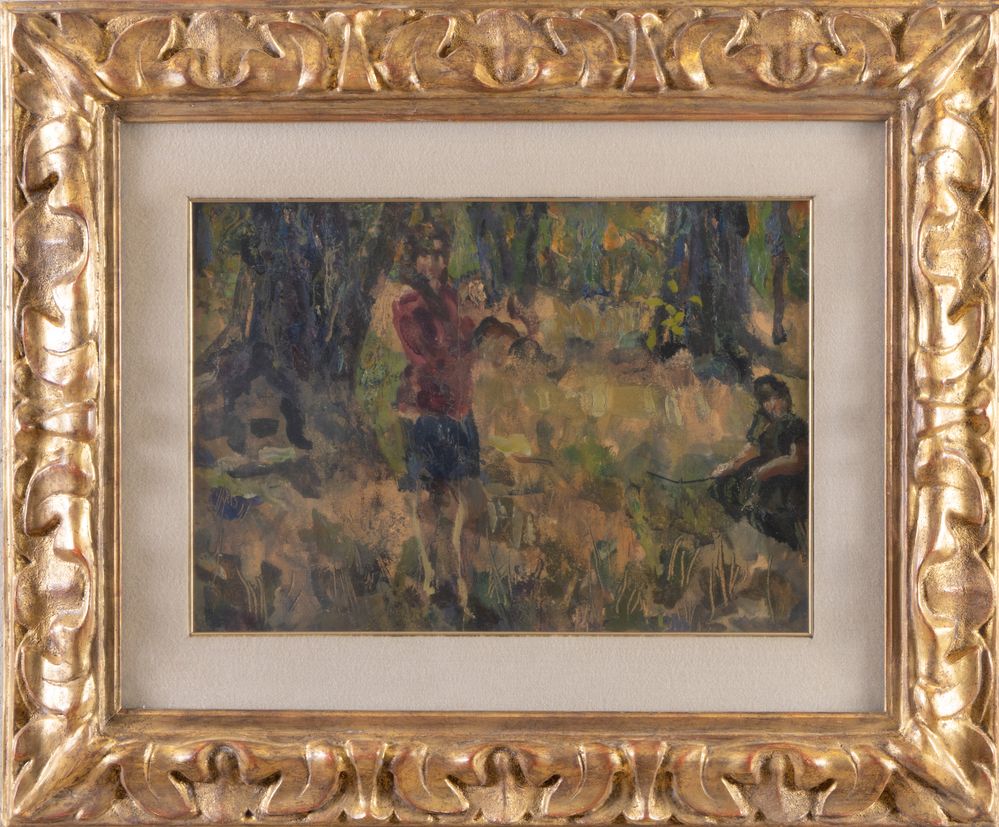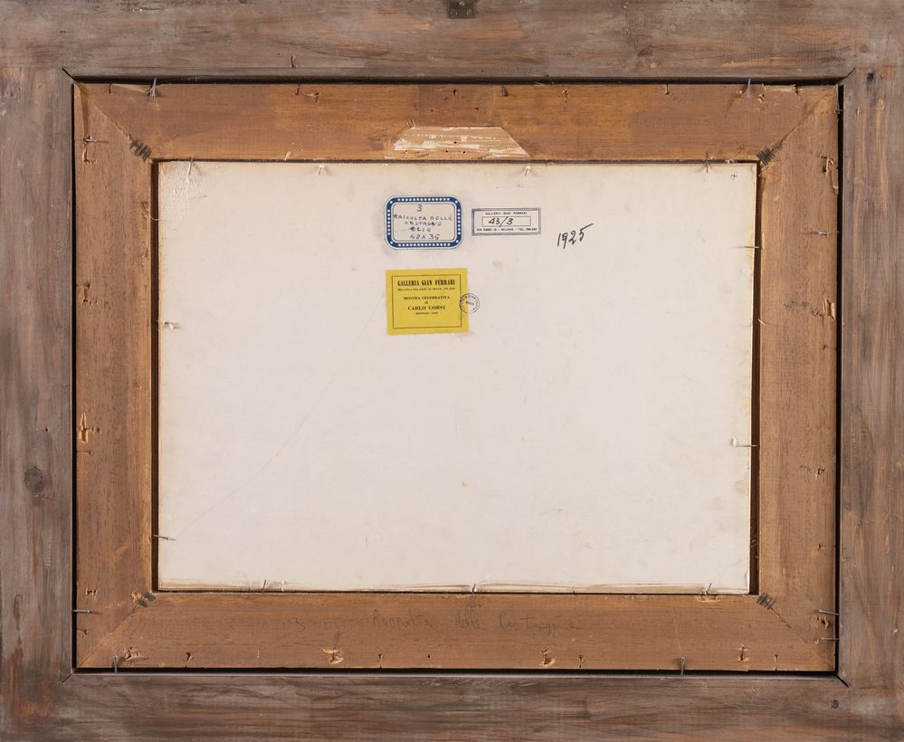 CARLO CORSI (Nizza 1879 – Bologna 1966) "La raccolta delle castagne", 1925. Olio su cartone. Cm 35x48. Opera firmata in basso a destra C. Corsi. Al retro reca timbro della Galleria Gian Ferrari, Milano. Reca etichetta della mostra celebrativa di Carlo Corsi, 1968, Galleria Gianferrari, Milano.