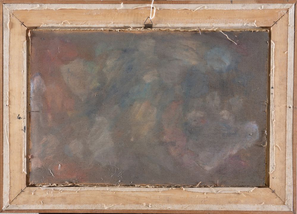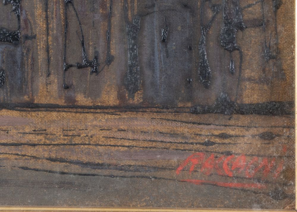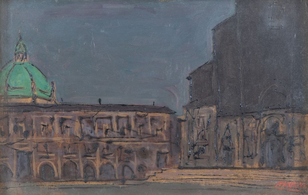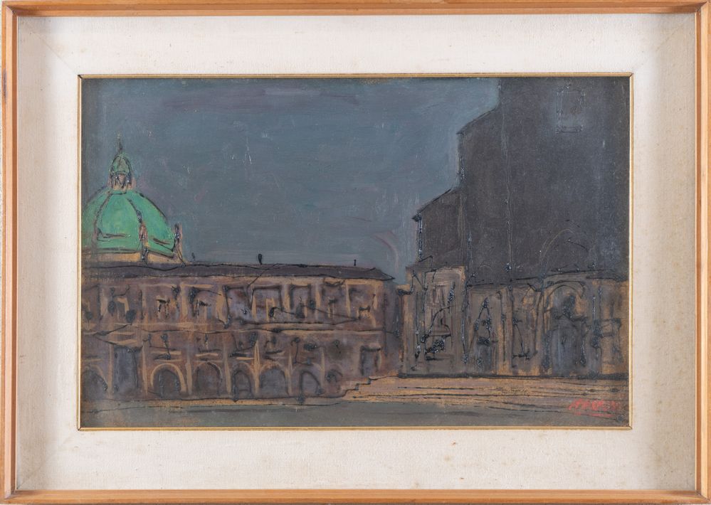 ANDREA RACCAGNI (Imola 1921- 2005) "Piazza Maggiore", 1945. Olio su tela applicata su faesite. Cm 35,5x54. Opera firmata in basso a destra Raccagni.