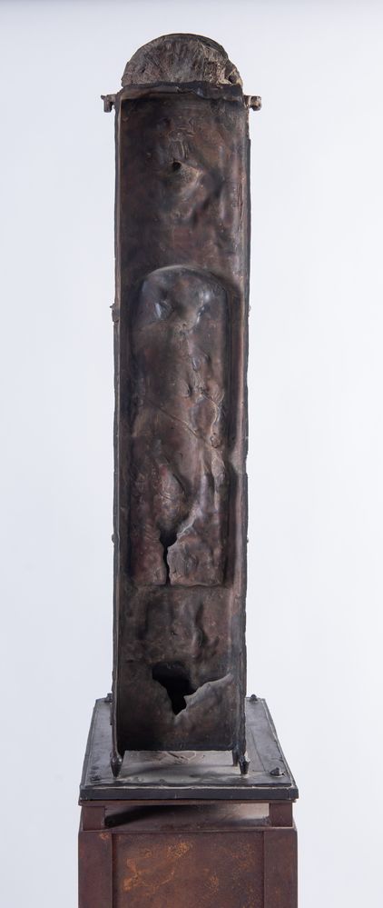 UGO RIVA (Bergamo 1951) "Vanitas", 1999. Scultura in bronzo a fusione a cera persa. Chiusa: cm 92x26x38; aperta: cm 92x35,5x38. A lato reca marchio a fuoco dell'artista. Opera datata in alto MCMXCIX. Alla base reca numeri di tiratura 1/6 P.A. Reca due marchi a fuoco della Venturi Arte Cera Persa, Bologna. Opera poggiante su basamento in acciaio Corten (altezza totale: cm 193,5). Opera accompagnata da autentica su catalogo a firma dell'artista. Esposizioni: Ugo Riva. "Il Viaggio". Palazzo dei Notai, Bologna, 2000. Bibliografia: Catalogo della mostra Ugo Riva. "Il Viaggio". Palazzo dei Notai, Bologna, 2000, pag. 33.