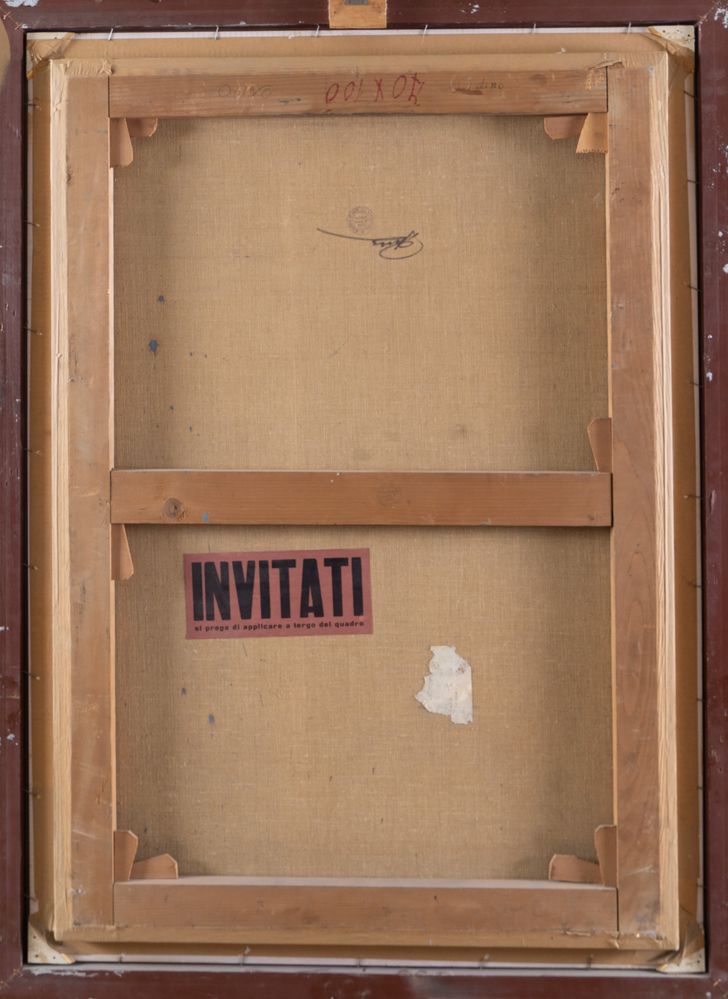 RICCARDO TOMMASI FERRONI (Pietrasanta 1934 - Camaiore 2000) "Senza titolo". Olio su tela. Cm 100x70. Opera firmata in basso a destra Riccardo Tommasi Ferroni. Al retro reca timbri con firma della Galleria d'arte La Barcaccia, Napoli. Al retro reca frammento di etichetta non leggibile.