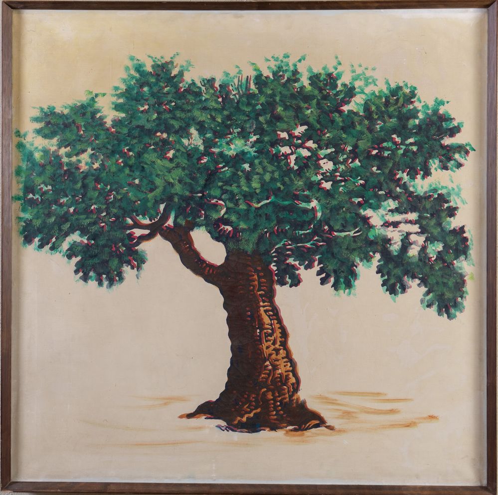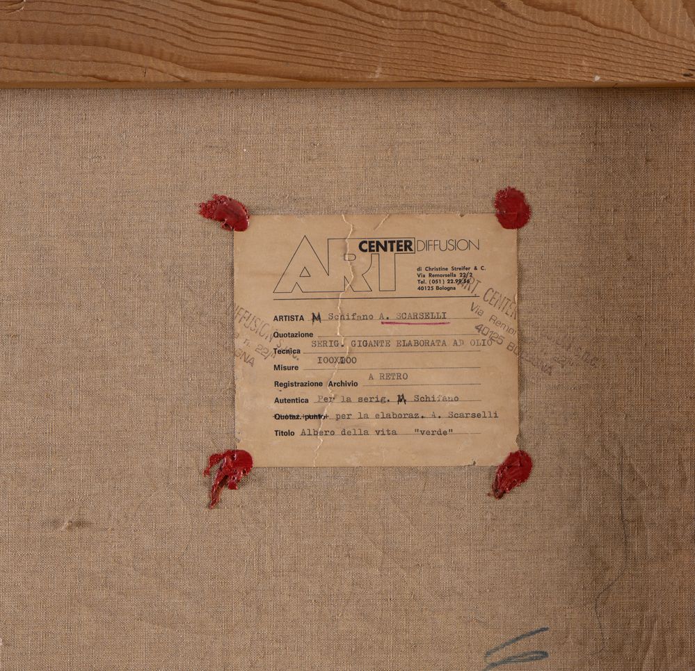 MARIO SCHIFANO (Homs 1934 - Roma 1998) "Albero", anni '70. Monotipo su tela con intervento. Cm 97,5x97,5. Al retro opera firmata Schifano. Al retro reca etichetta con timbro di Art Center Diffusion, Bologna.