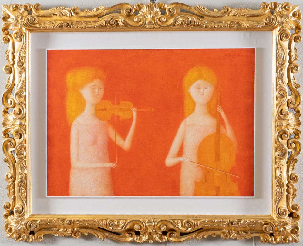ANTONIO BUENO (Berlino 1918 - Fiesole 1984) "Concerto", 1969. Olio su faesite. Cm 50x70. Opera firmata e datata in alto a destra Antonio Bueno 1969. Al retro reca etichetta Galleria Palazzo Carmi, Parma. Opera archiviata presso l'Archivio Antonio Bueno - Isabella Bueno, con numero d'inventario AB038/018. Opera accompagnata da autentica su fotografia, rilasciata da Galleria Contemporarte, a firma A. Bueno e Sergio Denti con impronta digitale del pittore. Opera accompagnata da autentica su fotografia dell'Archivio Antonio Bueno a firma M.Isabella Bueno in data 31 Ottobre 2018.