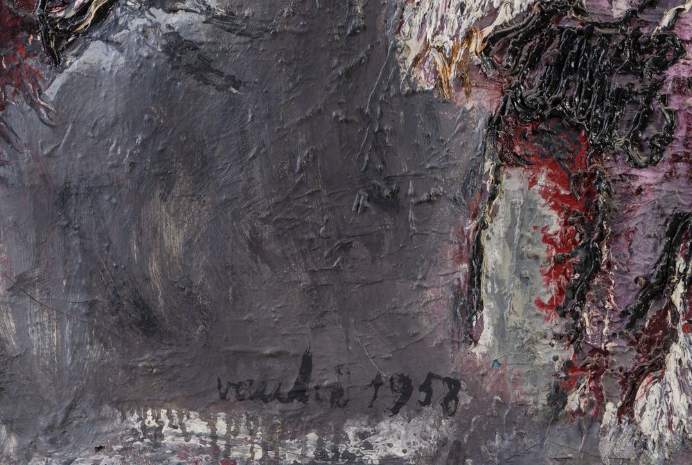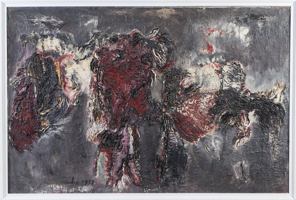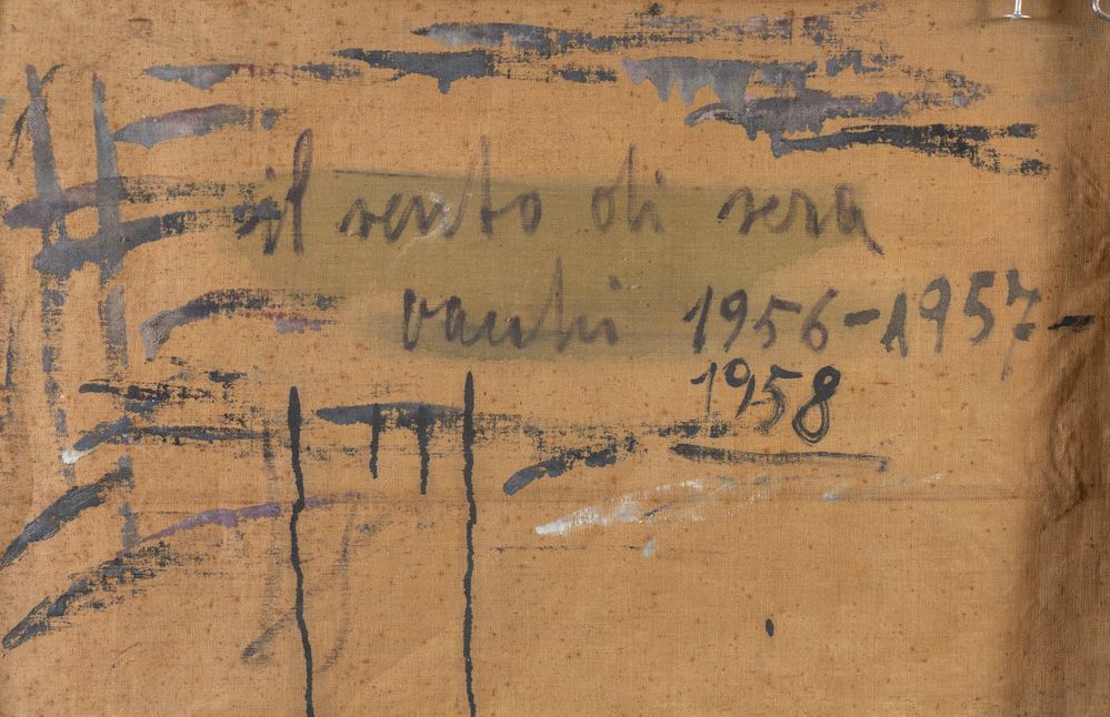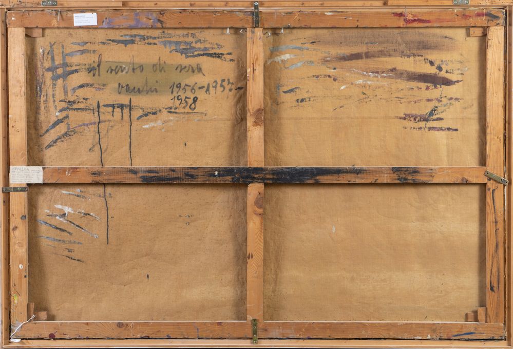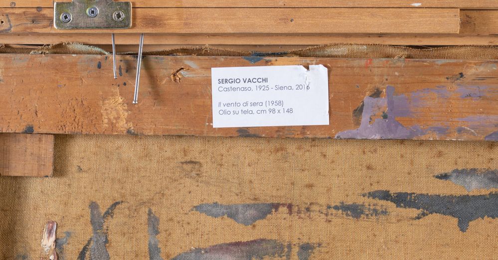 SERGIO VACCHI (Castenaso 1925 - Siena 2016) "Il vento di sera", 1958. Olio materico su tela. Cm 98x148. Opera firmata e datata in basso a sinistra Vacchi 1958. Al retro opera intitolata, datata e firmata Il vento di sera, Vacchi, 1956-1957-1958. Al retro reca etichetta della Galleria d'arte San Luca, Bologna, con timbro. Al retro reca timbro di mostra.