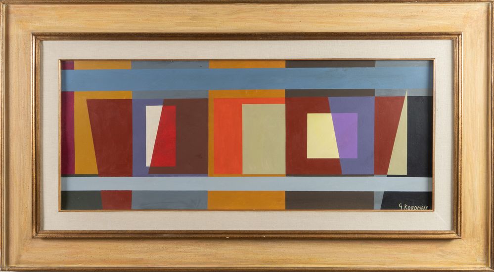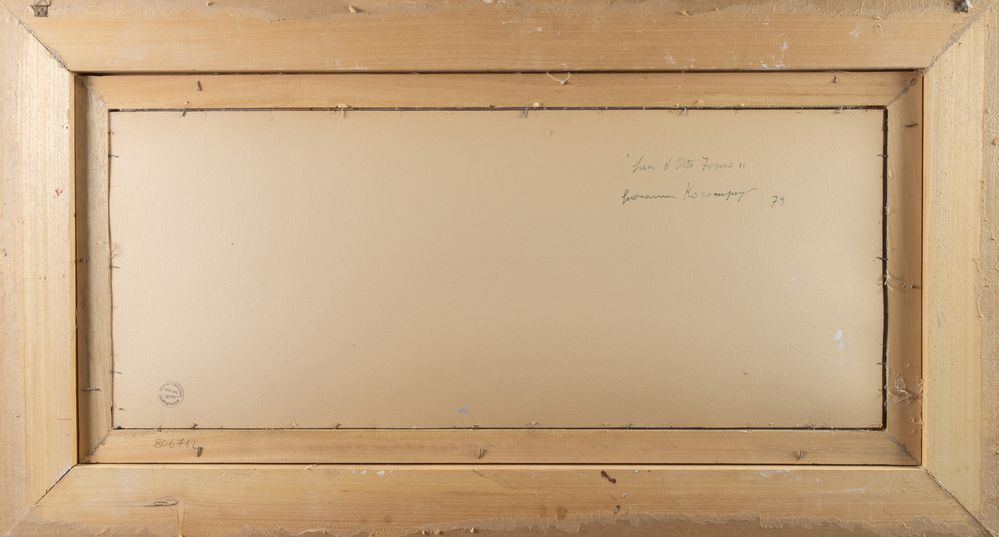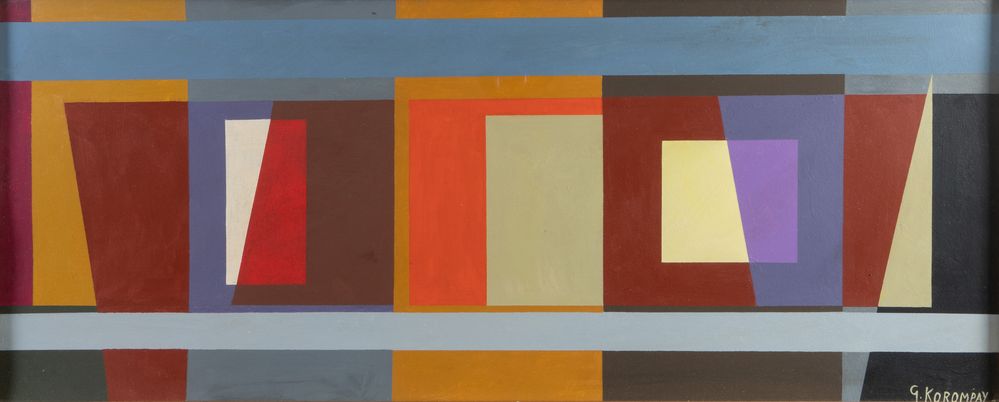 GIOVANNI KOROMPAY (Venezia 1904 – Rovereto 1988) "Luci d'altoforno", 1979. Olio su tavola. Cm 40,5x98,5. Opera firmata in basso a destra G. Korompay. Al retro opera intitolata, firmata e datata Luci d'altoforno, Giovanni Korompay, '79. Al retro reca timbro della Galleria d'Arte Bonaparte, Milano.