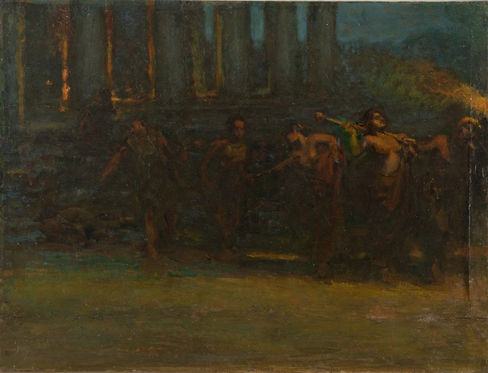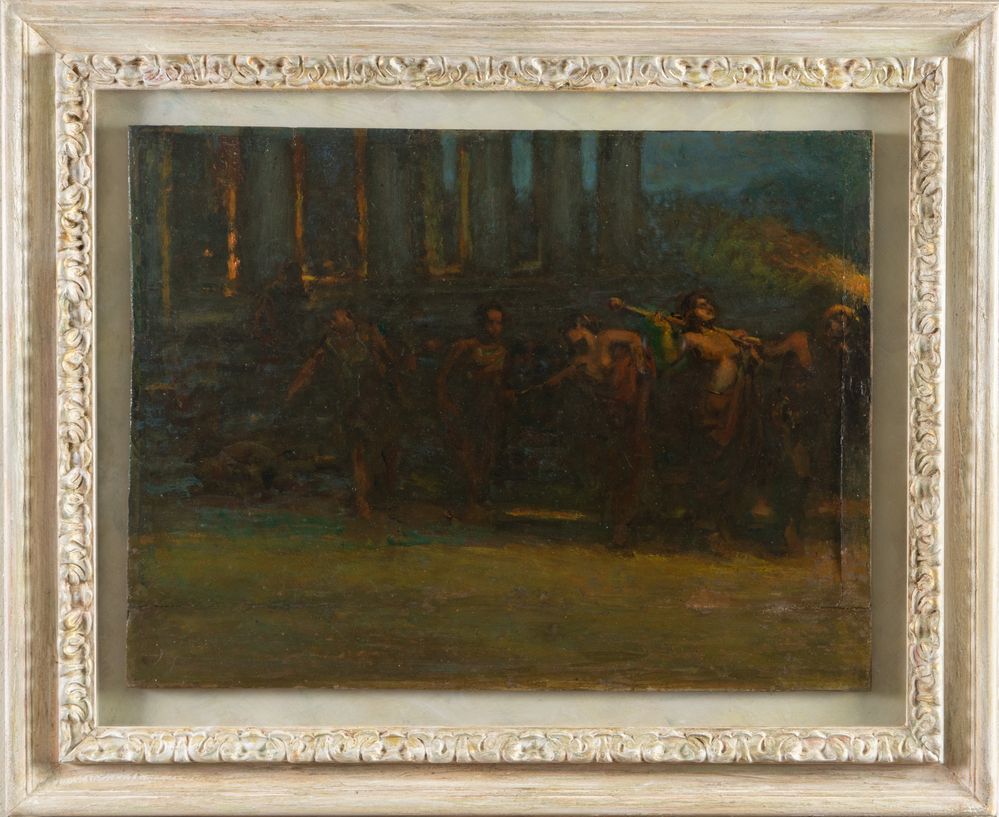 AUGUSTO MAJANI (Budrio 1867 – Buttrio 1959) "Scena Romana - Saturnali", 1893-94. Olio su tela applicata su tavola. Cm 43x67.