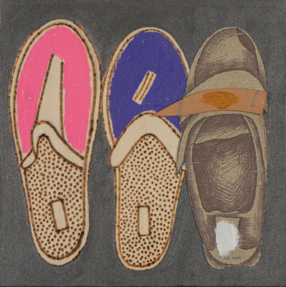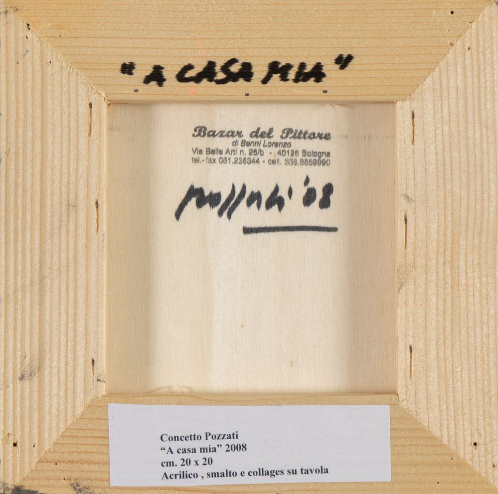 CONCETTO POZZATI (Vò 1935 – Bologna 2017) "A casa mia", 2008. Acrilico, smalto e collages su tavola. Cm 20x20. Al retro opera intitolata, firmata e datata A casa mia Pozzati '08. Opera accompagnata da certificato di antenticità della GlobArt, Acqui Terme.