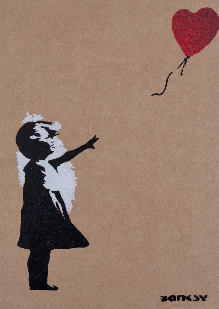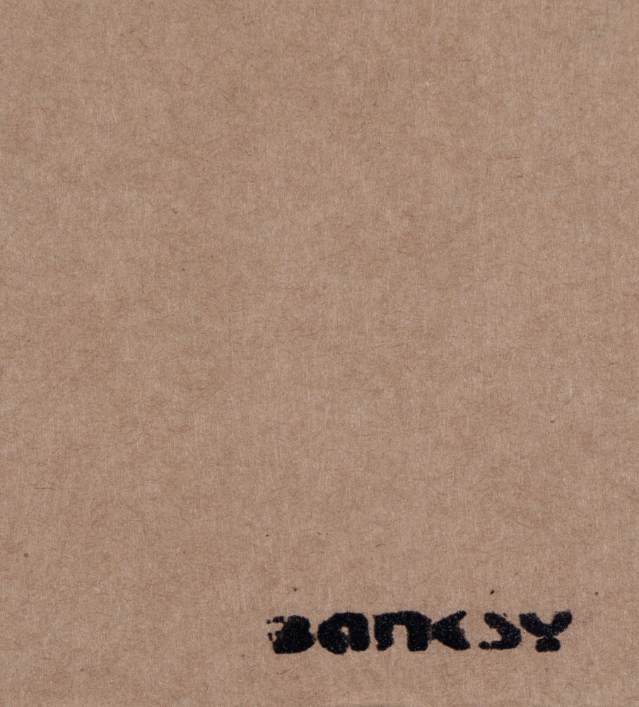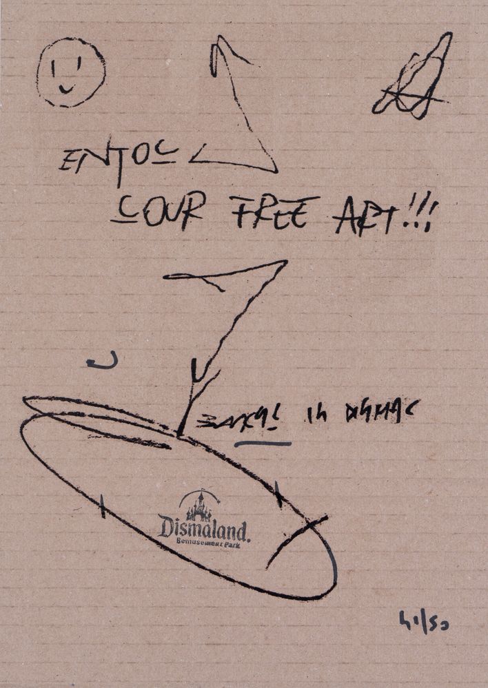 BANKSY (Bristol 1974) "Dismaland", 2015. Spray su cartone. Cm 30x21. Opera firmata al retro Banksy. Al retro reca numeri di tiratura 41/50. Al retro reca timbro Dismaland. Opera accompagnata da ticket d'ingresso a Dismaland.